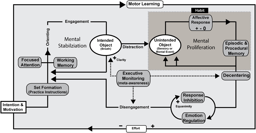 | 2. Attention Regulation | Provides volitional control over shifting and managing conscious awareness. | Components include alerting, orienting, engaging, sustaining, monitoring, disengaging, and re-engaging. Advanced practice yields effortless control and reduced resource allocation (e.g., smaller attentional blink). |