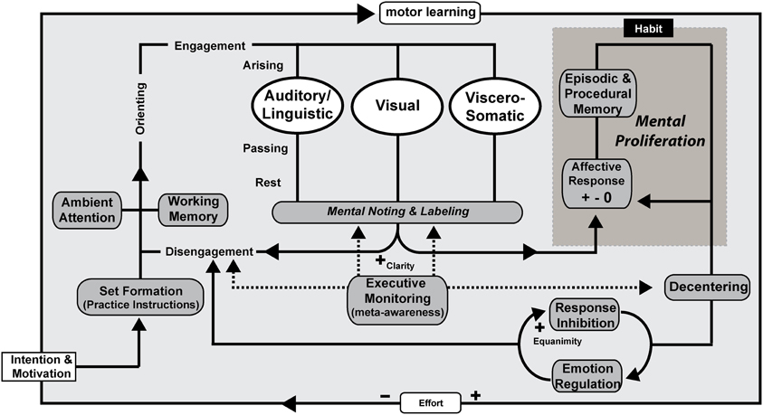 | Open Monitoring (OM) | Neutralization: Extinction and reconsolidation of maladaptive scripts/schemas. | Non-reactivity: Decreased allotment of resources toward any particular feeling or thought. | De-fusing: Thoughts are no longer fused with reality; move toward Non-dual Awareness. |